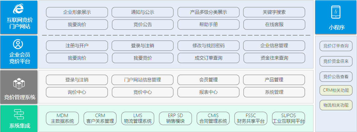 网上竞拍系统云商平台,又称网上竞拍平台,面向互联网客户,提供品牌营销、在线询价、在线开户、在线交易和专业售后服务,实现“公开、公正、公平”的双赢交易体系;同时实现与内部CRM/ERP/物流/财务等应用系统的一体化融合,构建一体化B2B交易与运营管控平台。